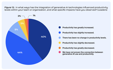 84 % des dirigeants affirment également que l’intégration de l’IA a eu un impact positif sur la productivité. Pour 40 %, la productivité a fortement augmenté et pour 44 %, elle a légèrement progressé. 9 % n’ont pas constaté de changement particulier, tandis que la productivité a légèrement baissé pour 5 % et fortement pour 2 %.