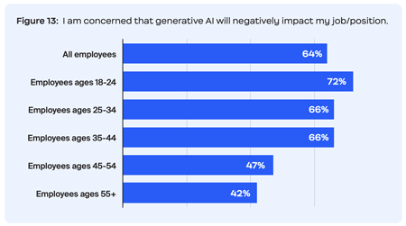 Cependant, de nombreux salariés craignent que l’IA générative ait un impact négatif sur leur emploi/poste. Cette tendance est fortement influencée par l’âge : alors que 72 % des 18-24 ans sont de cet avis, le pourcentage diminue au fur et à mesure que l’on avance dans l’âge, avec 42 % pour les 55 ans et plus.
