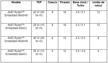 Les nouveaux Computer-on-Modules conga-TCR8 de congatec sont disponibles avec quatre processeurs AMD Ryzen Embedded 8000 différents, dotés de six ou huit cœurs « Zen 4 ». Ils prennent en charge jusqu’à 128 Go de mémoire DDR5-5600 avec code de correction d’erreur (ECC) pour les applications gourmandes en données et les applications critiques. Avec le NPU AMD XDNA™ intégré (16 TOPS) et le graphique AMD Radeon RDNA™ 3, qui peut également être utilisée comme GPGPU pour les tâches d’IA avec jusqu’à 12 unités de calcul, ils offrent une puissance de calcul combinée allant jusqu’à 39 TOPS. Ils prennent également en charge la sortie graphique immersive sur un maximum de quatre écrans avec des résolutions allant jusqu’à 8k. Pour une connectivité périphérique rapide, ils offrent six interfaces PCIe Gen 4 (8 voies) avec PEG x8 Gen 4, trois interfaces DisplayPort (DP), une eDP ou LVDS, quatre ports USB 3.2 Gen 2 et quatre ports USB 2.0. Les signaux audio sont délivrés via HAD, et le stockage de masse peut être intégré via deux ports SATA 6 Gb/s ou un SSD NVMe en option directement sur le module. Des interfaces embarquées classiques telles que SPI, UART, I2C et GPIO complètent l’ensemble des fonctionnalités.