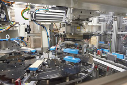 Les détecteurs de lumière à réflexion diffuse de Leuze laser surveillent également le déchargement des cellules d’un LLC dans une ligne de modules de ThyssenKrupp Automation Engineering. Chaque cellule reçoit également un « bouclier thermique », un isolant thermique protecteur, qui est pressé sur les longs côtés. Des robots font tourner les cellules dans la position souhaitée sur une machine circulaire. Là aussi, les capteurs de Leuze apportent leur soutien : les cellules photoélectriques reflex PRK 25 détectent la présence des objets. Le processus de fabrication des boucliers thermiques se déroule en parallèle sur deux stations afin d’obtenir un temps de traitement élevé.