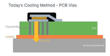 Avec cette approche, l’efficacité d’un transfert thermique du composant vers l’air ambiant est largement dépendante des propriétés du PCB telles que, la taille du plan de cuivre, les couches de cuivre, le poids du cuivre, et la configuration du cuivre. Cela est valable indépendamment de la liaison entre la carte et le dissipateur thermique. En conséquence de ce chemin de disspation thermique restreint, la capacité de puissance maximale du composant est restreinte, car la faible conductivité thermique du PCB freine la dissipation de la chaleur.