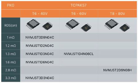 À l’intérieur, l’appareil TCPAK57 contient un clip en cuivre pour la source et les raccordements au drain. Cela remplace le câblage par fil et permet la conduction de courants élevés avec une résistance minimum, ainsi qu’une connexion thermique efficace vers la partie latérale du pad. Le nouveau composantfournit l’efficacité électrique nécessaire dans les applications de puissance élevées avec des valeurs RDS(ON) aussi faibles que 1 mΩ.