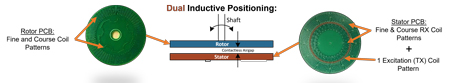 Des traces conductrices fines et moins fines (double), ou bobines, sont imprimées sur les deux surfaces du disque. Une troisième trace conductrice, appelée bobine d’excitation, est imprimée sur le circuit du stator. Le NCS32100 transmet une onde sinusoïdale de 4 MHz dans la bobine d’excitation, créant un champ électromagnétique autour de la bobine d’excitation du stator. En raison de la loi de Faraday et l’induction mutuelle, les bobines du rotor rencontrent le champ électromagnétique, couplant l’énergie sur les bobines du rotor sous forme de courants de Foucault.