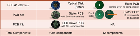 Une solution optique typique nécessite au total trois circuits imprimés : un disque optique, un circuit imprimé de stator et un circuit imprimé de pilote de LED, soit environ 100 composants pour une fonctionnalité complète.