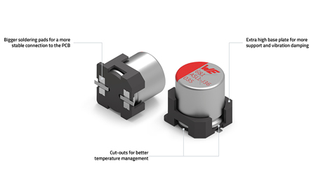 Cependant, pour rendre l’électronique résistante aux vibrations, il n’est pas nécessaire de recourir à des techniques de connexion spéciales telles que l’emmanchement. Les versions résistantes aux vibrations des condensateurs Würth Elektronik sont dotées de plots de soudure plus grands pour une connexion plus stable au circuit imprimé et d’une base plus haute pour un meilleur support et un meilleur amortissement des vibrations. Afin de maintenir une gestion optimale de la température, le célèbre fabricant de composants électroniques et électromécaniques a doté la base de ces condensateurs de découpes spéciales.