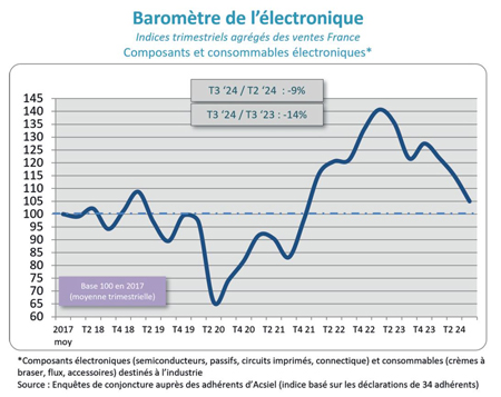 Analyse : L’indice Acsiel des composants électroniques (semiconducteurs, passifs, circuits imprimés, connecteurs) et consommables a reculé de 9% au troisième trimestre 2024 par rapport au trimestre précédent, soit une baisse de 14% en glissement annuel.