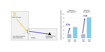 Kyocera a effectué des tests dans un environnement 5G à ondes millimétriques (28GHz) en intérieur afin d’évaluer l’efficacité du film méta-surface. Lors de ces tests, un appareil mobile a été placé dans une zone où la couverture du signal de la station de base était faible. Cela a entraîné une faible réception du signal. Lorsque le film méta-surface a été appliqué sur la vitre d’une fenêtre, la vitesse de transmission s’est considérablement améliorée, les vitesses de téléchargement pouvant être multipliées par 2,7 et les vitesses de téléversement par 5,2.
