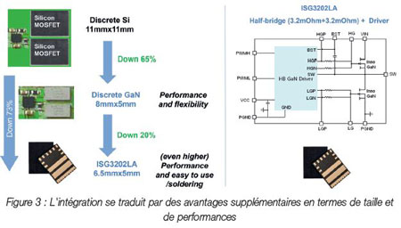 L’application d’entraînement par moteur introduit un autre développement : l’intégration. La figure 3 montre qu’en passant du silicium au GaN, la taille est réduite de 65 %. Toutefois, Innoscience propose désormais des circuits intégrés SolidGAN qui intègrent la solution complète en demi-pont, y compris le commutateur, le pilote et la protection dans un boîtier de 6,5 x 5 x 1,1 mm. Les dispositifs tels que l’ISG3202LA comprennent deux HEMT GaN 100 V 3,2mΩ en e-mode (demi-pont) avec pilote, résistance de commande, bootstrap et condensateurs Vcc. Ce dernier a une capacité de courant continu de 60A, aucune charge de récupération inverse et une résistance ultra-faible. Grâce au haut niveau d’intégration, à l’optimisation de la boucle de grille et de la boucle d’alimentation réalisés sur l’ISG3202LA, les parasites sont maintenus au-dessous de 1nH. Par conséquent, les pics de tension sur les noeuds de commutation sont minimisés. Surtout, cette solution intégrée est 20% davantage plus petite que la solution GaN discrète. Bien entendu, le nombre de composants et la fiabilité sont également améliorés.