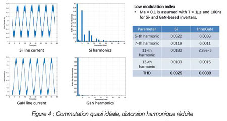Un avantage supplémentaire est la réduction de la distorsion harmonique totale. La figure 4 compare les ondes de courant de sortie pour le GaN et le silicium ainsi que les harmoniques. Comme le GaN est proche d’un commutateur parfait, la sortie est une onde sinusoïdale beaucoup plus propre. Les harmoniques chutent de manière significative, par conséquent il n’est pas nécessaire de recourir à des « astuces » de conception telles que la compensation des temps morts ou le filtrage pour éliminer les harmoniques. Ainsi, la solution est beaucoup plus simple et moins coûteuse avec moins de bruit du moteur.