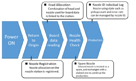 L’évaluation de la prise des composants se sert quant à elle de la caméra latérale installée en standard sur la machine de report pour vérifier l’orientation des composants après la prise. Elle fournit un moyen rapide pour tester la constance de paramètres importants de la machine, comme la hauteur de prise, le mouvement X-Y ou la reconnaissance de vision. Cette option génère des données de prise optimisées qui contribuent à raccourcir le temps de configuration par composant lors de l’introduction d’un nouveau produit, mais aussi à compléter les informations sur les composants pendant la fabrication. Le logiciel, aidé des paramétrages et jugements automatisés, détermine rapidement la compatibilité des buses, optimise la vitesse de mouvement de la tête de placement et évalue les informations de prise, d’où un temps de décision réduit à quelques secondes seulement.