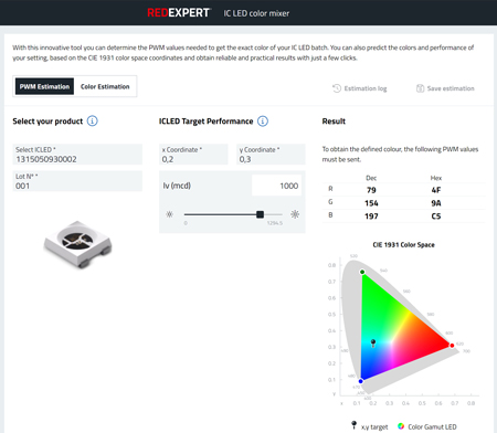 Le calculateur de couleurs ICLED de REDEXPERT est dotée d’une interface utilisateur intuitive, permettant aux utilisateurs de sélectionner le type d’ICLED souhaité, le lot, ainsi que la couleur et la luminosité dans le système de couleurs standard CIE 1931 (« espace colorimétrique xy »). L’outil génère ensuite automatiquement les signaux numériques appropriés pour la modulation de largeur d’impulsion (PWM) des LED RGB dans le composant ICLED. Ces valeurs peuvent être directement reprises dans la programmation. Ceci est possible grâce au processus de tri méticuleux lors de la production des ICLED. Würth Elektronik propose des LED dont la température de couleur et les propriétés de luminosité sont identiques pour chaque lot. La précision du contrôle de la qualité et du binning permet à l’entreprise d’ouvrir de nouvelles options pour des applications LED avancées en utilisant son outil de développement innovant.