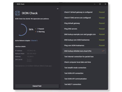 IXON Check teste le réseau du client pour déterminer si un IXrouter ou un client VPN IXON fonctionnera sur ce réseau. Il vérifie automatiquement, par exemple, la configuration de la passerelle par défaut et des serveurs DNS, ping les noms d’hôtes IXON, teste la connexion Internet pour détecter les pertes de paquets et vérifie la communication API IXON et la connexion MQTT.