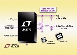 Linear Technology Corporation annonce le LTC3775, un régulateur DC/DC à découpage, abaisseur, synchrone, à faible durée minimum de mise en marche et à gamme de tensions d’entrée étendue, qui pilote tous les MOSFET canal N des étages de puissance. Avec une durée de mise en marche minimale de moins de 30 ns, le LTC3775 convient pour les forts rapports de conversion en abaisseur.