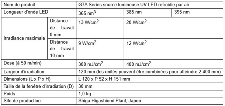G7A dispose d’une structure évolutive par incréments de 120 mm. Cela permet d’ajuster la largeur d’irradiation d’un minimum de 120 mm à un maximum de 2 400 mm, en connectant plusieurs unités de source lumineuse. La largeur d’irradiation peut ainsi être personnalisée de manière flexible afin de s’adapter à une grande variété de supports imprimés. De plus, le système peut se connecter à des appareils externes via une communication série, ce qui permet d’ajuster avec précision la largeur d’irradiation des LED par incréments d’environ 30 mm.