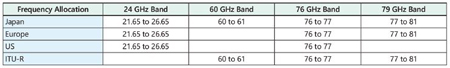 Les radars automobiles fonctionnent généralement dans les bandes de 24 et 76 GHz. La bande 24 GHz est utilisée pour la surveillance du périmètre à courte et moyenne distance, pour la réduction des dommages avant et après une collision, ainsi que pour la surveillance de l’avant et de l’arrière du véhicule. En raison de sa haute résolution, le radar 76-77 GHz est principalement utilisé pour détecter les obstacles situés entre 100 et 200 mètres devant le véhicule. Le radar est également utilisé pour des applications de détection à l’intérieur du véhicule ou "dans l’habitacle". Par exemple, les systèmes qui empêchent les enfants ou les animaux d’être laissés seuls dans les voitures fonctionnent dans les bandes de fréquences de 60 à 77 GHz. Le tableau 1 indique les fréquences attribuées aux radars automobiles dans chaque région.