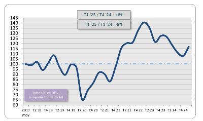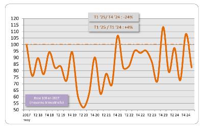 Au premier trimestre 2025, l’indice Acsiel des biens d’investissement pour l’industrie électronique a chuté de 24%, une baisse conforme à la saisonnalité pour ce type d’équipements industriels. En revanche, en glissement annuel l’indice est en progression de 4%, ce qui constitue une amélioration par rapport au quatrième trimestre 2024 où notre indice était en baisse de 5%.