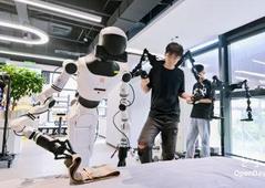 Depuis le centre d’entraînement sur les données situé à Pékin, un opérateur RealMan a dirigé des robots humanoïdes présents sur le stand à Hangzhou pour qu’ils s’acquittent de tâches interactives complexes (passer une serviette, distribuer des fruits, etc.).