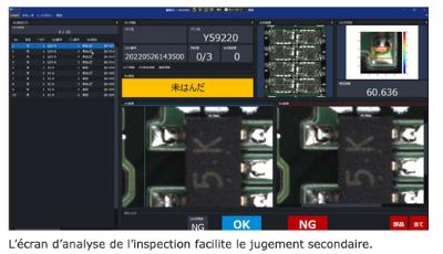 Le logiciel d’aide à la décision basée sur l’IA pour l’AOI de Yamaha fournit aux opérateurs des informations complètes pour justifier leurs décisions de validation ou de rejet, notamment des images, des tableaux et un indice de confiance. Lorsqu’un défaut de brasure apparaît (p. ex. un pont ou une contamination), cet indice s’affiche sous la forme d’une carte thermique et d’un indice d’anomalie calculé. L’évaluation des autres défauts, comme la reconnaissance des caractères, est exprimée sous la forme d’un taux de correspondance. Le logiciel tient également un journal de ses propres performances, avec des calculs du taux de détection des anomalies et de suppression de la surdétection. Grâce à de multiples recueils de données et analyses, y compris de la réduction du bruit, et à des outils pour construire et optimiser des modèles d’IA personnalisés, le logiciel d’aide à la décision basée sur l’IA laisse aux utilisateurs la main sur le cycle d’apprentissage automatique et le contrôle qualité, sans assistance professionnelle.
