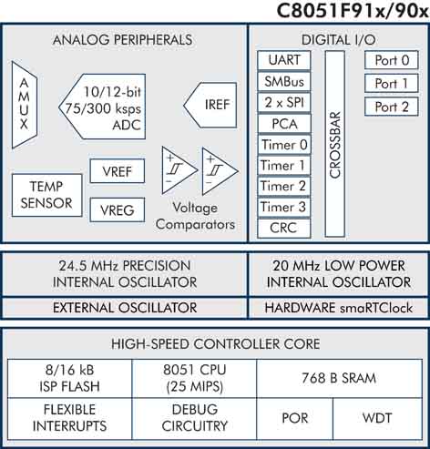 Les F91x/0x étendent la famille primée de MCU C8051F9xx y avec des versions économiques à 8 et 16 Ko de mémoire flash, tout en délivrant une performance de coeur CPU de 25 MIPS et en fournissant des périphériques analogiques avancés, dont un convertisseur analogique/numérique 12 bits avec mode burst autonome, ce qui économise de l’énergie. Les MCU ultra basse consommation de la famille F9xx de Silicon Labs sont compatibles entre eux du point de vue logiciel et de l’empreinte physique ; il en résulte que les développeurs utiliseront la même implantation de carte et le même code en cas de migration vers des versions économiques.