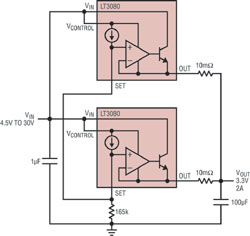 Comme indiqué, la mise en parallèle de plusieurs circuits pour obtenir un courant de sortie plus élevé résout plusieurs problèmes. La dissipation de chaleur peut être répartie sur plusieurs régulateurs pour qu’il n’y ait pas de points chauds sur le circuit imprimé. Si un courant plus élevé que celui que peut fournir un seul régulateur est nécessaire, il est facile d’ajouter un second régulateur. L’architecture du LT3080 et du LT3092 permet la mise en parallèle directe contrairement à n’importe quel autre type de régulateur. Un ajustage interne de la puce permet de maintenir la différence de tension entre la broche de réglage et la sortie à moins de quelques millivolts. Ceci permet de mettre les régulateurs en parallèle en reliant respectivement les broches de réglage et les broches de sortie.