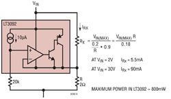 Le courant dans RX est dans la boucle de rétro action et est compensé parce que la tension entre l’entrée et la sortie varie. Le courant circule dans le transistor PNP interne ou dans la résistance externe tandis que la boucle de rétro action maintient le courant total constant. Pour une bonne régulation et pour assurer une marge raisonnable, le courant dans RX ne doit pas être supérieur à 90 % du courant désiré pour le circuit à la tension maximum. Les formules de l’illustration montrent comment choisir RX pour que le courant dans RX laisse toujours 10 % du courant qui passe dans le LT3092. Ceci réduit la puissance interne maximum en déplaçant une partie de la puissance vers la résistance externe. Il en résulte une réduction importante de la dissipation du composant, ainsi qu’une diminution de l’augmentation de température. L’effet de l’insertion de cette résistance externe est négligeable sur la performance du circuit.