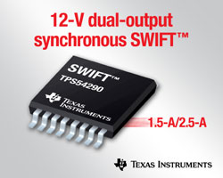 Texas Instruments Incorporated (TI) lance son premier circuit intégré de gestion d’énergie SWIFT™ double sortie synchrone. Le TPS54290 1,5 A/2,5 A simplifie la conception des alimentations 12V destinées aux équipements électroniques grand public, tels que les décodeurs et les téléviseurs numériques. Pour en savoir plus, consultez la page : http://www.ti.com/tps54290-preu.
