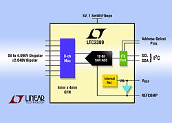 Les canaux d’entrée peuvent être sélectionnés par logiciel pour des signaux d’entrées unipolaires ou bipolaires. Fonctionnant sur une alimentation unique de 5 V, le LTC2309 consomme seulement 1,5 mW à la vitesse de conversion de 1 kéch./s et 35 µW en mode arrêt. Encapsulé en un petit boîtier QFN-24, 4 mm x 4 mm, avec une référence de tension intégrée, le LTC2309 convient parfaitement pour les instruments portables et les systèmes à espace réduit, utilisant une interface I²C.