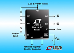 Le choix de la polarité et une référence de tension de sortie avec tampon permettent au LTC2919 de gérer une combinaison de deux alimentations positives ou négatives dans des conditions de sous tension (UV) et de surtension (OV). Les deux entrées possèdent un seuil de tension nominale de 0,5 V avec une précision de ± 1,5 % sur toute la gamme de températures. En plus de gérer deux entrées réglables en cas de sous tension ou de surtension, le LTC2919 gère la tension d’alimentation à 2,5 V, 3,3 V ou 5 V pour une sous tension à - 10%. Les marges réglables des seuils de tension sont ajustées par un diviseur résistif, ce qui donne aux utilisateurs le contrôle total de l’excursion autour de la valeur de seuil. Présenté dans les petits boîtiers MSOP-10 et DFN-10 de 3 mm x 2 mm, ce superviseur ne consomme que 50 µA. Avec des spécifications garanties sur la gamme de températures – 40°C à +125°C, le LTC2919 peut être employé dans une grande variété de conceptions, incluant les serveurs de réseau et les systèmes à plusieurs rails de tension.