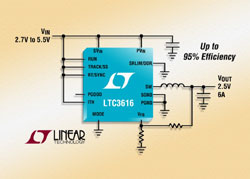 Le LTC3616 est un régulateur à découpage synchrone, 4 MHz, de haut rendement, présenté par Linear Technology, qui possède une architecture à mode courant et à fréquence fixe. Le LTC3616 intègre des commutateurs, à faible résistance, qui lui permettent de fournir une intensité continue de sortie jusqu’à 6 A, à partir d’un boîtier QFN de 3 mm x 5 mm. Son fonctionnement à faible chute de tension autorise une gamme de tensions de sortie de 0,6 V à quelques millivolts sous la tension d’entrée VIN. Le LTC3616 marche à partir d’une tension d’entrée comprise entre 2,25 V et 5,5 V, ce qui le rend idéal pour les applications alimentées sur un élément de batterie Li-ion, ainsi que pour les systèmes à bus de tension intermédiaire 3,3 V ou 5 V. Sa fréquence de commutation est programmable par l’utilisateur de 300 kHz à 4 MHz, permettant l’emploi de petits condensateurs et inductances, à coût réduit.
