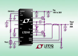 Linear Technology annonce le LT3741, un convertisseur DC/DC abaisseur, synchrone, conçu pour réguler, avec une précision de ± 6%, les courants de sortie jusqu’à 20 A. Avec sa gamme de tensions d’entrée, de 6 V à 36 V, et un fonctionnement à courant constant et tension constante, il est idéal dans un grand nombre d’applications allant des chargeurs de batterie et de supercondensateur, des pilotes de laser, aux éclairages à DEL de forte intensité. Le LT3741 utilise deux commutateurs MOSFET, externes, et génère un courant continu de sortie jusqu’à 20 A, sur la gamme de tensions de 0 V à 34 V. Des rendements aussi élevés que 95% permettent de se passer de radiateurs externes. La fréquence du LT3741 peut être programmée et synchronisée de 200 kHz à 1 MHz, ce qui permet aux concepteurs d’optimiser le fonctionnement tout en réduisant la taille des composants externes. Encapsulé dans un boîtier QFN-20, de 4 mm x 4 mm, ou TSSOP-20, à performances thermiques renforcées, le LT3741 offre une source à courant et tension constantes très compacte.