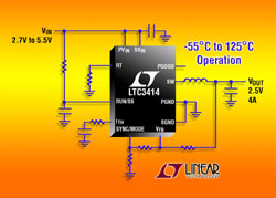 Le LTC3¬414 est un régulateur à découpage, synchrone, 4 MHz, de haut rendement, fonctionnant à fréquence fixe, avec une architecture en mode courant. Il peut fournir une intensité continue de sortie jusqu’à 4 A, pour des tensions de sortie aussi basses que 0,8 V. Il fonctionne à partir d’une tension d’entrée comprise entre 2,25 V et 5,5 V, ce qui le rend idéal pour les applications alimentées sur un élément de batterie Li-ion ou NiMH, ainsi que pour les systèmes d’usage général à lignes d’alimentation fixes. La version de classe MP fonctionne pour une température de jonction de – 55°C à 125°C, et est testée et garantie sur toute la gamme de températures. La précision de la tension de boucle de retour est légèrement modifiée (± 0,5%), mais les autres caractéristiques électriques sont identiques aux versions de classe E et de classe I. Elles conviennent parfaitement aux applications militaires et aérospatiales qui sont exposées à des températures ambiantes extrêmes.