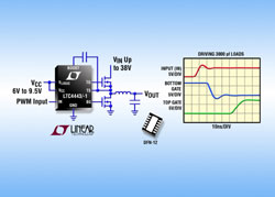 Le LTC4443/-1 possède une entrée PWM à trois états pour arrêter l’étage de puissance qui est compatible avec tous les contrôleurs multi-phases ayant une sortie à 3 états. Il possède également une alimentation séparée pour les circuits logiques d’entrée, assurant la compatibilité avec l’excursion du signal du circuit intégré contrôleur, et possède aussi un circuit de blocage en cas de sous tension, à la fois sur les alimentations du pilote et du circuit logique. De plus, ce composant pilote les deux MOSFET, supérieur et inférieur, sur une gamme de tensions de 6 V à 9,5 V et fonctionne sur une tension d’alimentation jusqu’à 38 V. La version -1 a une tension Vcc de blocage supérieure, en cas de sous tension, de 6,2 V au lieu de 3,2 V, dans le but de piloter des MOSFET canal N, de tension de niveau logique 5 V standard.