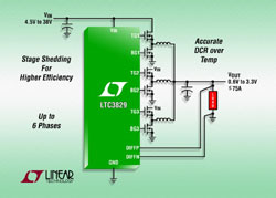 Le LTC3829 intègre le mode Stage SheddingTM pour accroître le rendement aux faibles charges, ce mode consiste à stopper les étages 2 et 3 éliminant ainsi la charge de grille des MOSFET et les pertes de commutation de deux de ses étages de sortie. De plus, le LTC3829 peut être configuré en mode de fonctionnement Burst Mode® qui réalise un rendement supérieur aux faibles charges. En option, un mode de contrôle non-linéaire permet d’améliorer la réponse aux transitoires de changement de charge et le réglage du positionnement de la tension (AVP) réduit au maximum la variation du transitoire de tension pendant un changement de charge.