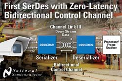 National Semiconductor Corp. (NYSE : NSM) présente sa famille de SerDes (sérialiseur dé-sérialiseur) Channel Link III à canal de contrôle bidirectionnel et latence nulle intégré ; une première sur le marché. Ces SerDes permettent d’acheminer l’horloge, les données haut-débit et le bus de commande I2C bidirectionnel bas-débit sur une même paire torsadée. Ceci réduit radicalement les dimensions, le poids et les coût d’interconnexion, jusqu’à 50% dans le cas d’applications industrielles de vidéo, d’imagerie ou d’affichage.