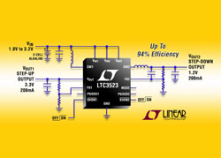 Les LTC3523/-2 fonctionnent à partir d’une gamme de tensions d’entrée de 1,8 V à 5,5 V, ce qui les rend appropriés pour les applications alimentées sur un élément de batterie Li-ion / polymère ou deux éléments de batterie NiMH / alcaline. En particulier, l’association d’un convertisseur abaisseur et d’un régulateur élévateur est idéale pour les applications alimentées sur deux éléments de batterie alcaline, dans lesquelles une ligne Entrée / Sortie de 3,3 V pour microprocesseur et une ligne de tension de cœur de 1,2 V sont nécessaires. Le redressement synchrone permet d’atteindre des rendements de 94%, tandis que le fonctionnement en Burst Modeâ réduit le courant de repos à seulement 45 µA, ce qui augmente l’autonomie sur batterie des applications portables. La fréquence constante synchronisée de 1,2 MHz (LTC3523) ou de 2,4 MHz (LTC3523-2) permet d’obtenir un fonctionnement à faible niveau de bruit et de haut rendement. La combinaison d’un boîtier QFN-16, 3 mm x 3 mm, et de condensateurs et d’inductances de petite taille conduit à une réalisation de petite empreinte requise par les applications portables.