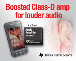Texas Instruments Incorporated (TI) (NYSE : TXN) lance son amplificateur audio mono Classe D 2 W avec convertisseur boost intégré, fournissant une puissance audio supérieure de 36% à celle des circuits concurrents, et ce de manière constante sur toute la plage de tension utilisable d’une batterie Li-Ion. Fournissant un rendement élevé, le TPA2015D1 assure une durée de vie deux fois supérieure à celle de l’amplificateur concurrent le plus proche et se présente dans un boîtier compact WCSP de 2mmx2mm, pour les applications contraignantes en termes d’espace comme les smartphones, les notebooks, les systèmes de navigation portables, les stations d’accueil portables et les lecteurs de DVD portables. En outre, cet amplificateur inclut une fonction de commande automatique du gain (CAG) qui surveille la tension de la batterie, ainsi que la technologie SpeakerGuard, pour empêcher toute coupure prématurée du son au cas où la tension batterie est faible et tout écrêtage, ce qui protège les haut-parleurs.