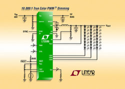 Le LT3596 emploie un seul commutateur interne de 60 V, 800 mA, pour réaliser une source de courant constant, en mode abaisseur. Le convertisseur abaisseur interne possède une boucle de retour réglable pour réguler la tension de sortie à un niveau de tension légèrement plus élevé que celui nécessaire à la DEL, afin d’assurer un rendement maximum. Si une des guirlandes de DEL se trouve en circuit ouvert, le circuit continuera à réguler les autres guirlandes et enverra un signal d’alerte sur la broche FAULT. Les autres caractéristiques incluent un détarage de l’intensité du courant de DEL en fonction de la température de jonction et / ou de la température de la DEL, ainsi qu’une déconnexion des DEL à l’arrêt.