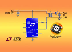 Le LT3575 fonctionne en mode de conduction critique (Mode Boundary), qui est un contrôle en mode intensité, à découpage et à fréquence variable, permettant une régulation totale de ± 5%, sur les gammes de la tension d’entrée, des courants de charge et de températures. Le fonctionnement en mode conduction critique permet aussi l’emploi d’un transformateur plus petit de ceux employés dans les conceptions à mode conduction continue équivalentes. La tension de sortie est facilement fixée à l’aide de deux résistances externes et du rapport du transformateur. Plusieurs transformateurs standard, mentionnés dans la fiche de caractéristiques, pouvant convenir à de nombreuses applications. Le haut degré d’intégration et le fonctionnement en mode Boundary conduisent à un produit d’application simple et propre, répondant aux problèmes traditionnels des alimentations isolées.