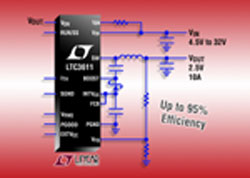 Le LTC3611 utilise des transistors commutateurs internes, à résistances RDS(0N) de seulement 15 mohm et 9 mohm, pour un rendement pouvant atteindre 95%. Le LTC3611 peut être configuré en mode discontinu ou continu forcé. Le mode continu forcé réduit le bruit et les interférences RF, alors que le mode discontinu permet des rendements élevés en réduisant les pertes de commutation aux faibles charges en ne consommant que 900 µA au repos. Les autres caractéristiques incluent un gestionnaire de tension de sortie à drapeau « puissance correcte », un réglage de la limite de courant, une protection contre les surtensions et un démarrage progressif programmable.