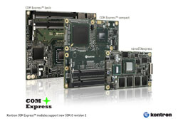 Kontron annonce ce jour le support de la spécification COM Express COM.0 R 2.0 récemment lancée par le PICMG (PCI Industrial Computer Manufacturers Group). En tant que membre du PICMG, Kontron a participé activement au développement de cette spécification. La révision 2 de COM Express COM.0 donne beaucoup plus d’envergure au développement des applications, améliorant le temps de mise sur le marché et le coût total de possession.