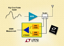 Linear Technology présente le LTC5583, un détecteur de puissance efficace, à deux canaux adaptés, avec une isolation de 55 dB, à 2,14 GHz. Dans les applications à amplificateur de puissance (PA) RF, le LTC5583 procure une solution simple pour mesurer avec précision la puissance directe, la puissance réfléchie et le taux d’ondes stationnaires en tension (VSWR). Le composant possède une paire de détecteurs de puissance efficace, à gamme dynamique de 60 db qui sont adaptés à 1,25 dB. Ceci permet la mesure des signaux de puissance RF à facteur de crête élevé, comme ceux utilisés dans les LTE, WiMAX, W-CDMA, TD-SCDMA et stations de base CDMA 2000 3G ou 4G ou autres radios, à hautes performances, utilisant des signaux à modulations complexes. Chaque canal peut détecter, avec précision, des signaux faibles de – 58 dBm à 2 dBm, avec une réponse log-linéaire à linéarité typique meilleure que ± 0,5 dB, couvrant toutes les bandes de fréquences des téléphones cellulaires. Aux fréquences plus élevées, le composant peut offrir une gamme dynamique utile de 47 dB jusqu’à 6 GHz. Propre au LTC5583, chacun des détecteurs assure, simultanément, le suivi de l’enveloppe du signal d’entrée modulé, ce qui procure une possibilité, intégrée à la puce, de mesurer à la fois la crête et la moyenne de la puissance du signal.