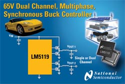 National Semiconductor Corp. (NYSE : NSM) présente le LM5119, un contrôleur abaisseur synchrone á tension élevée, deux canaux, double phase, à commande ECM (Emulated Current Mode, ou mode courant émulé). Le LM5119 permet la régulation de tensions d’une simple sortie ou double à forte intensité, à partir de tension d’entrées allant jusqu’à 65V, simplifiant ainsi la conversion CC-CC á tension élevée, tout en réduisant l’encombrement sur la carte jusqu’à 50%, par rapport aux solutions à deux étages de conversion. Le LM5119 offre une combinaison unique de haute performance, de flexibilité et de facilité d’utilisation pour les applications de commande exigeantes, des secteurs télécommunications, automobile, ou industriel, nécessitant une régulation de tension précise. Ce circuit étend la gamme de contrôleurs abaisseur synchrones á tension élevée de National, destinés aux courants élevés.