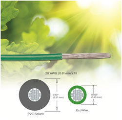 L’offre initiale EcoWire est constituée d’un fil UL AWM 11028 disponible en dimensions allant de 28 AWG (0,07 mm2) à 10 AWG (5,37 mm2) doté de conducteurs en cuivre étamé massif ou multibrin. Prévu pour des températures de fonctionnement de 105 °C, les fils satisfont aux exigences UL VW-1 sur l’inflammabilité.