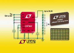 Linear Technology Corporation présente les LTM8042 et LTM8042-1, des pilotes DC/DC µModule® de DEL pour des guirlandes jusqu’à 8 DEL blanches ou 9 DEL rouges. Pouvant fonctionner en mode élévateur, abaisseur ou abaisseur-élévateur, à partir d’une gamme de tensions d’entrée de 3 V à 30 V, chaque composant est un pilote de DEL complet, dans un boîtier LGA de 9 mm x 15 mm x 2,8 mm. Les LTM8042 et LTM8042-1 présentent une précision de régulation de ligne du courant de sortie de 0,5% et peuvent résister à des transitoires jusqu’à 40 V en entrée. Le LTM8042 génère jusqu’à 1A, tandis que le LTM8042-1 génère jusqu’à 350 mA. Chacun présente un réglage de luminosité par contrôle True Color PWMTM, avec un rapport de luminosité de 3000 à 1 ou un réglage de luminosité analogique de rapport 10 à 1. La solution complète, robuste et compacte permet un passage rapide de la conception à la fabrication de circuits pilotes de guirlande de DEL, pour les applications comme l’éclairement dans l’industrie, le rétro-éclairage des écrans, les scanners, et celles de l’automobile aussi bien que de l’avionique.