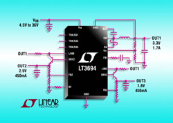 Le commutateur principal du LT3694 utilise un transistor 3,5 A de rendement élevé, avec l’oscillateur, les circuits logique, le contrôle et les convertisseurs LDO nécessaires, intégrés dans une seule puce. Des techniques de conception spéciales permettent un haut rendement, sur une large gamme de tensions d’entrée et son architecture à mode courant permet une réponse rapide aux transitoires et une excellente stabilité de boucle. Une broche pour détecter un courant de diode offre une limitation supplémentaire de l’intensité de sortie en cas de surcharge. Les autres caractéristiques incluent un drapeau « puissance correcte », des broches suivi de tension, de démarrage progressif indépendantes et un blocage programmable en cas de sous tension.