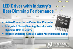 National Semiconductor Corp. (NYSE : NSM) présente un nouveau driver de LED, offrant les meilleures performances du marché en termes de variation lumineuse, pour applications à LED ultra-lumineuses. Le driver de LED LM3450 intègre un circuit de compensation PFC (Power Factor Correction, ou compensation "cosinus Phi"), et un gradateur à décodage de phase assurant une variation de luminosité uniforme, sans scintillement, sur une plage très large et programmable. Membre de la famille de produits éco-énergétiques PowerWise®, le LM3450 est bien adapté aux éclairages à LED hautes performances, à variation de phase, de 10 à 100 watts.