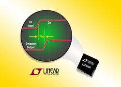 Linear Technology présente le LTC5564, un détecteur de puissance RF, fonctionnant de 600 MHz à 15 GHz, avec un temps de réponse exceptionnellement rapide de 7 ns, à partir d’un signal RF pulsé. De plus, le composant possède un comparateur véloce sur sa puce avec un retard de propagation de 9 ns. La tension de seuil du comparateur est fixée par l’utilisateur, permettant un point de basculement souple. La sortie du composant peut être verrouillée par une broche de validation de verrouillage, autorisant la capture rapide d’un évènement de courte durée, la survenue d’un signal unique ou d’une condition de dysfonctionnement. Ses performances, les meilleures de sa classe, permettent une vitesse, sans précédent, dans la mesure du temps, des réponses rapides après détection de dysfonctionnement et des mesures de puissances RF dans les systèmes hyperfréquences.