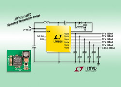 Cette tension de 5,6 V, en retour, alimente six régulateurs linéaires pour générer cinq tensions de 5V et une tension de 3,3 V, avec des intensités de sortie de 150 mA à 500 mA. Le LTM8008 est conçu pour fonctionner à des températures extrêmes, de – 40°C à 150°C. Toutes les versions sont disponibles sur stock.