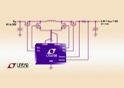 Un contrôleur DC/DC abaisseur-élévateur, synchrone, de rendement très élevé (jusqu’à 98%), qui fonctionne à partir de tensions d’entrée supérieures, inférieures ou égales à la tension de sortie régulée. Les circuits de forte puissance, en modes élévateur et abaisseur utilisent typiquement des transformateurs ou deux convertisseurs DC/DC, l’un pour la conversion en mode élévateur et l’autre pour la conversion en mode abaisseur. Le LTC3789 fonctionne, lui, avec une seule inductance, un redressement synchrone à quatre commutateurs, et peut fournir en sortie jusqu’à 150 W, avec un seul LTC3789. On peut obtenir des puissances plus importantes en en mettant plusieurs en cascade.