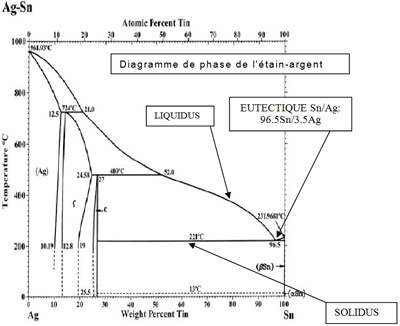 Le DIAGRAMME DE PHASE (voir illustration ci-dessous pour le système Sn-Ag) est une des caractéristiques importantes des alliages. Il s’agit d’une représentation graphique des propriétés des alliages en fonction de la teneur des métaux les constituant et de la température. Cette représentation en 2 dimensions est relativement simple pour les alliages binaires, mais devient quasiment inexploitable lorsque l’on a plus de 3 composants.